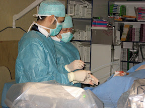 Una operación normal consta de dos médicos en la aula más dos ayudantes. El primer médico actua directamente sobre el paciente. El otro es el ayudante : da y prepara el material y las herramientas necesarios al desarollo ; controla el aparato de radiografía ; inyecta el producto de contraste, etc. Hay que precisar que todo functiona con la radiografía y el sangre con producto de contraste.